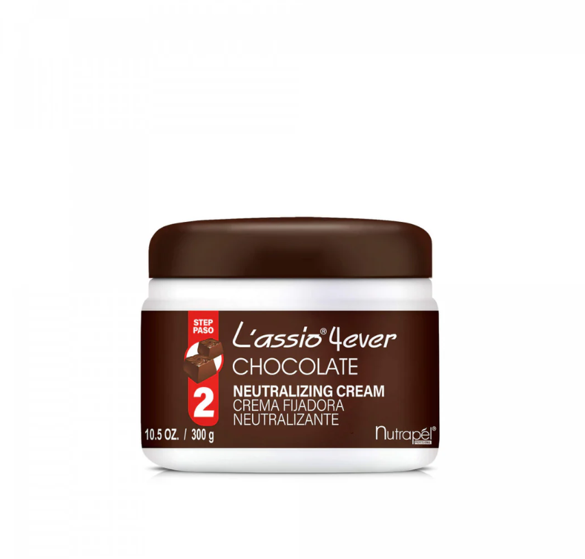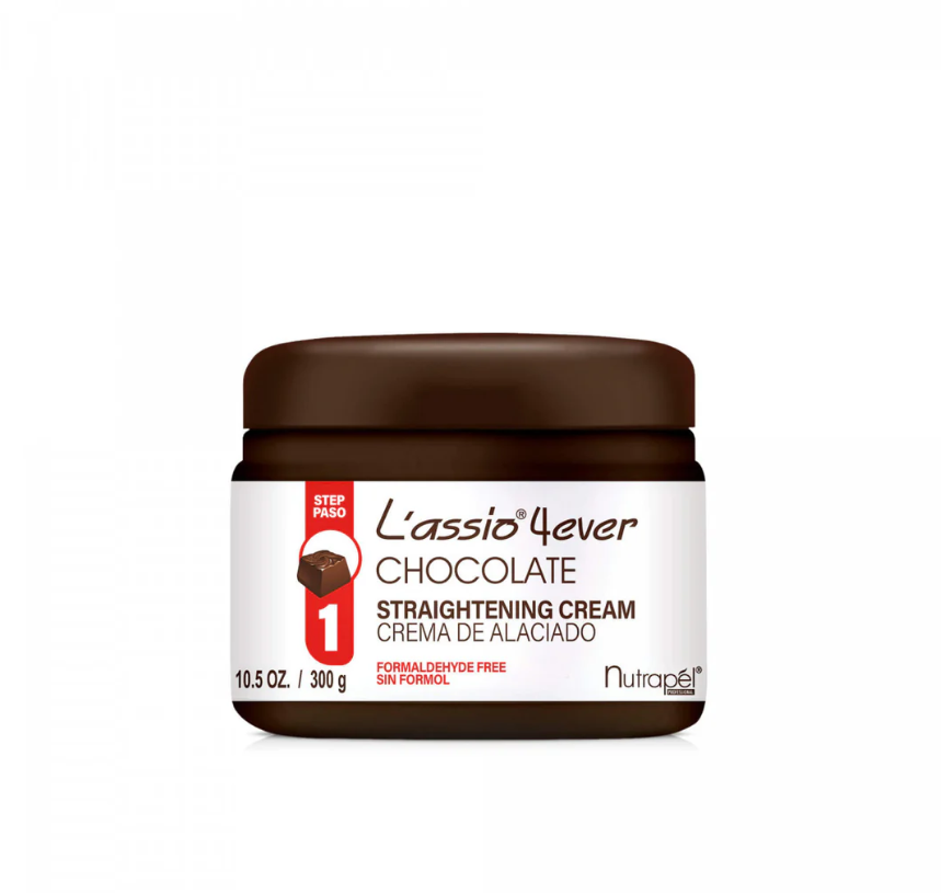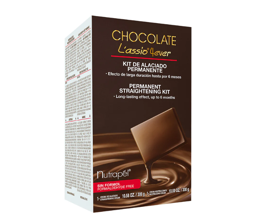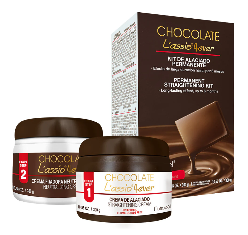 Chocolate L´assio 4ver es un Kit de Alaciado Permanente SIN FORMOL en dos pasos; con un complejo que actúa sobre la superficie y en el interior del cabello para un alaciado de larga duración (solo se necesitará retocar el crecimiento).