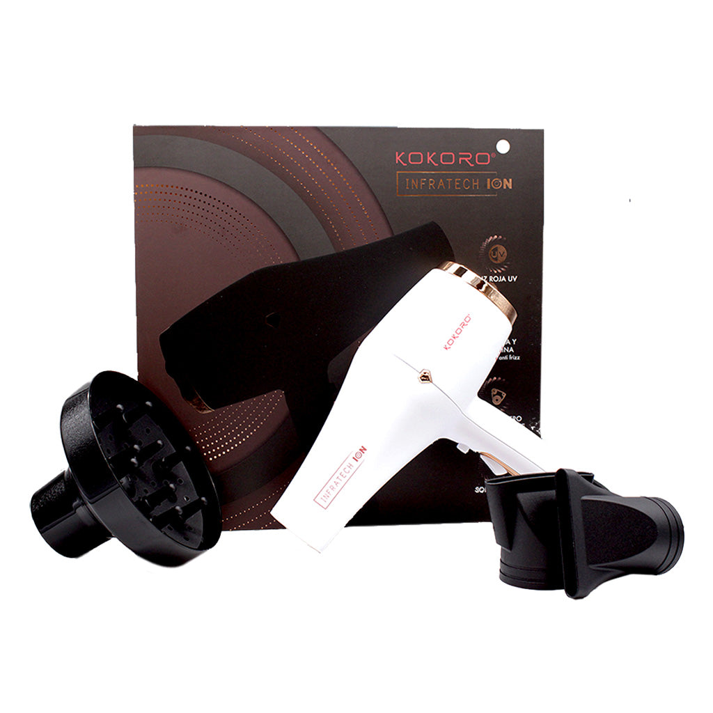 Secadora para pelo marca Kokoro de color negro con tecnología de luz roja UV, difunde un calor suave en la fibra capilar.