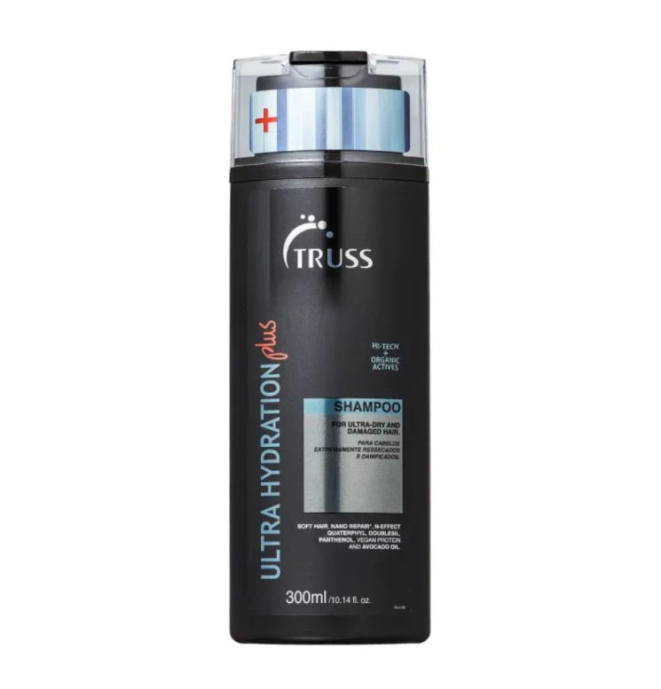 ULTRA HYDRATION Plus es un champú Truss para cabello seco, recomendado para cabello extremadamente dañado y seco, ya que asegura una limpieza eficiente y profunda para el cabello debilitado por tratamientos químicos, coloración u otros daños.
